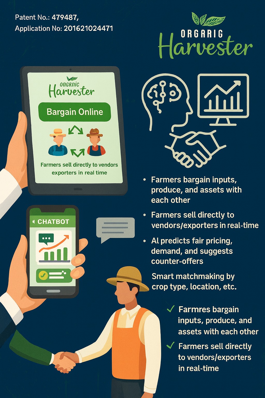 This invention discloses a comprehensive AI-powered agriculture trading platform branded as Organic Harvester, integrating an AI-enabled “Bargain Online” engine that allows: